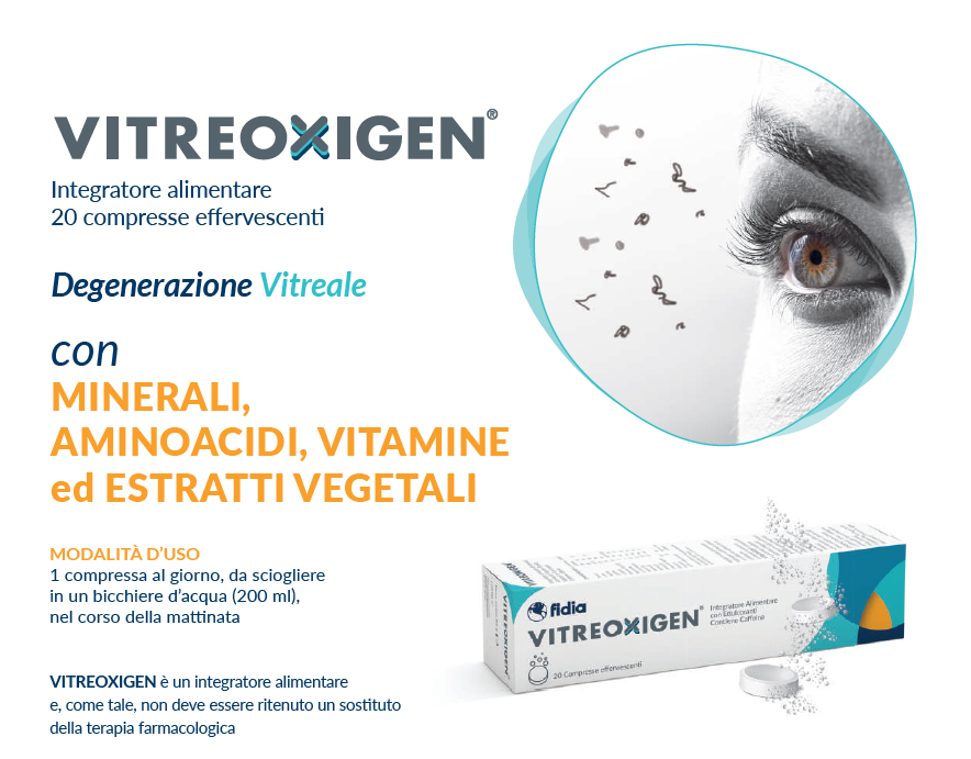 Vitreoxigen è un prodotto di Fidia Farmaceutici e si presenta in compresse effervescenti, contenenti una miscela di ingredienti attivi: