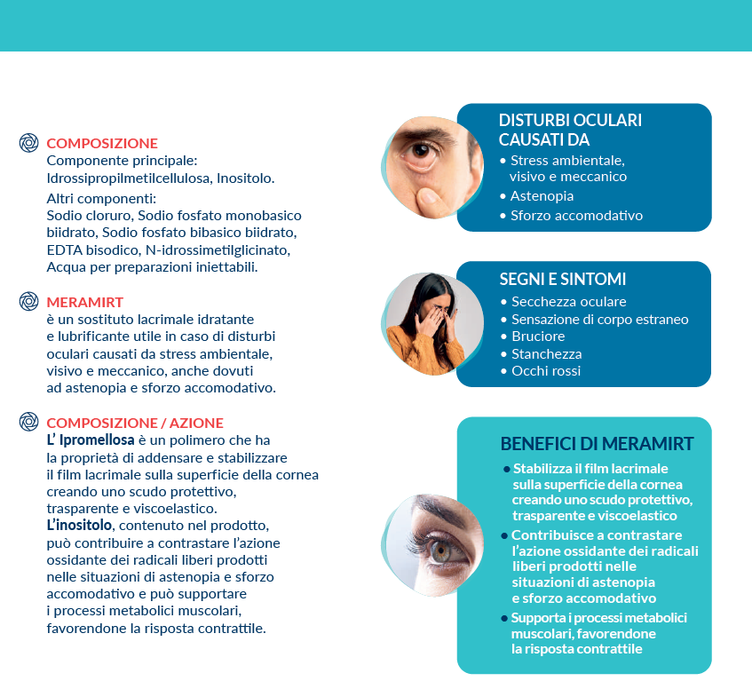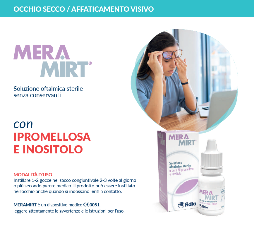 Meramirt Soluzione Oftalmica è un dispositivo medico sterile a base di due componenti chiave: Ipromellosa e Inositolo.