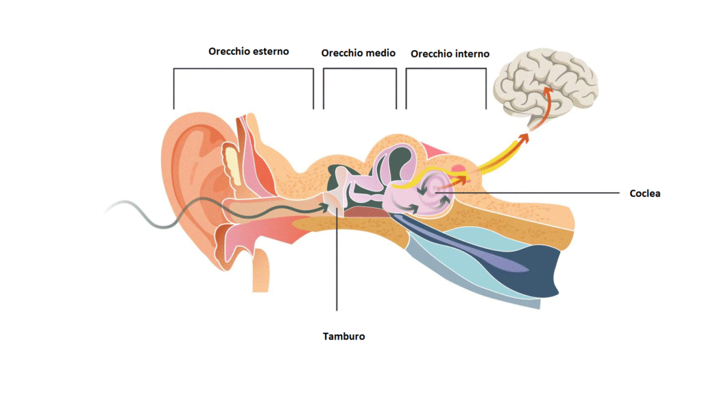 Il primo punto di contatto con il suono è l’orecchio esterno, che comprende il padiglione auricolare e il condotto uditivo e il cui scopo è catturare le onde sonore.